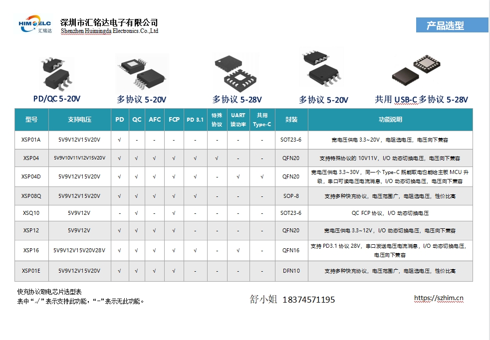 汇铭达根据市场的不同需求研发了多款支持不同功能的快充诱骗协议芯片,我们只需要根据设备的需求来选择合适的快充诱骗协议芯片