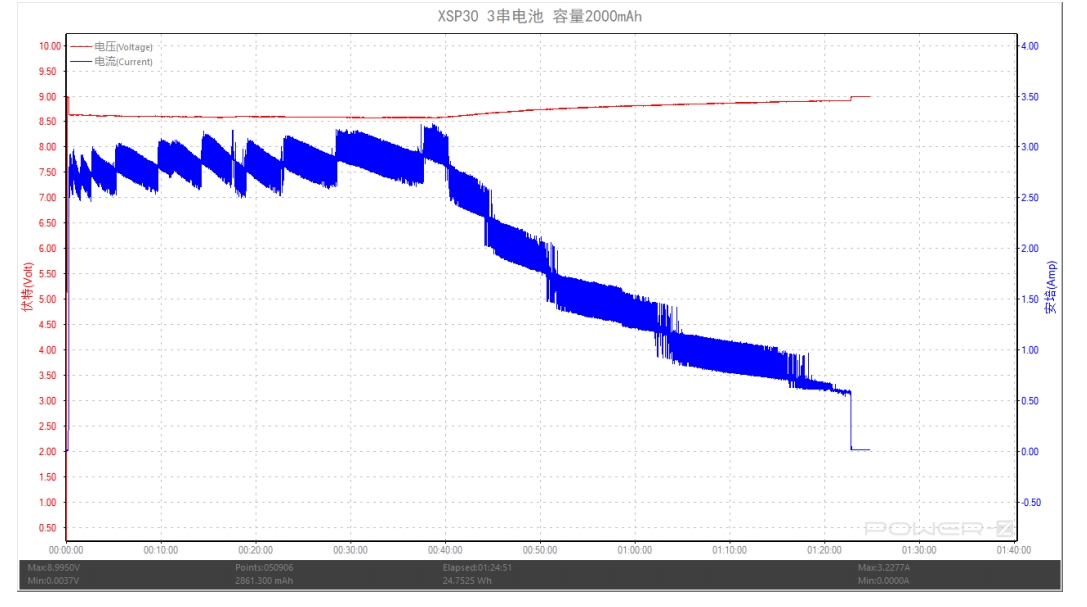 电池容量 2000mAh,3 节串联锂电池,使用 PD 协议充电器输入获取 9V/3A(27W) 功率,充电池电流设置 2A,充电时间:1 小时充到 80%,1 小时 30 分钟充满 100%