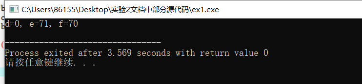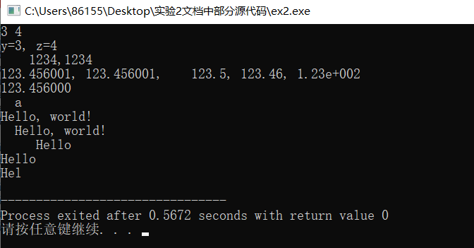 // ex2.cpp #include <stdio.h> int main() { int x=1234; float f=123.456; double m=123.456; char ch='a'; char a[]="Hello, world!"; // 定义一个数组a,数组中存放字符串常量hello,world! int y=3, z=4; printf("%d %d\n", y, z); printf("y=%d, z=%d\n", y,z); printf("%8d,%2d\n", x,x); printf("%f, %8f, %8.1f, %0.2f, %.2e\n",f,f,f,f,f); printf("%lf\n",m); printf("%3c\n", ch); printf("%s\n%15s\n%10.5s\n%2.5s\n%.3s\n",a,a,a,a,a); return 0; }