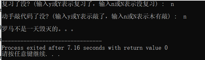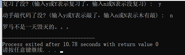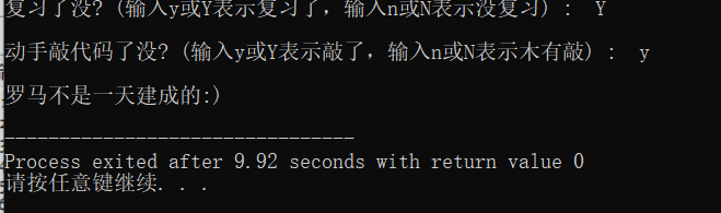// ex5.cpp #include <stdio.h> int main() { char ans1, ans2; printf("复习了没? (输入y或Y表示复习了,输入n或N表示没复习) : "); ans1 = getchar(); // 从键盘输入一个字符,赋值给ans1 getchar(); // 思考这里为什么要加这一行 printf("\n动手敲代码了没? (输入y或Y表示敲了,输入n或N表示木有敲) : "); ans2 = getchar(); if(ans2=='y'&&ans1=='Y'||ans1=='y'&&ans2=='Y') printf("\n罗马不是一天建成的:)\n"); else printf("\n罗马不是一天毁灭的。。。\n"); return 0; }