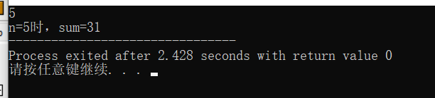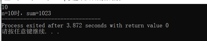 //ex6.cpp //等比求和 #include <stdio.h> int main() { int b,n; int q=2,a=1; int sum=1; scanf("%d",&n); for(b=1;b<n;b++) { a*=q; sum+=a; } printf("n=%d时,sum=%d",n,sum); return 0; }