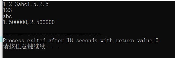 // ex3.cpp #include <stdio.h> int main() { double x,y; char c1,c2,c3; int a1,a2,a3; scanf("%d%d%d",&a1,&a2,&a3); printf("%d%d%d\n",a1,a2,a3); scanf("%c%c%c",&c1,&c2,&c3); printf("%c%c%c\n",c1,c2,c3); scanf("%lf,%lf",&x,&y); printf("%lf,%lf\n",x,y); return 0; }