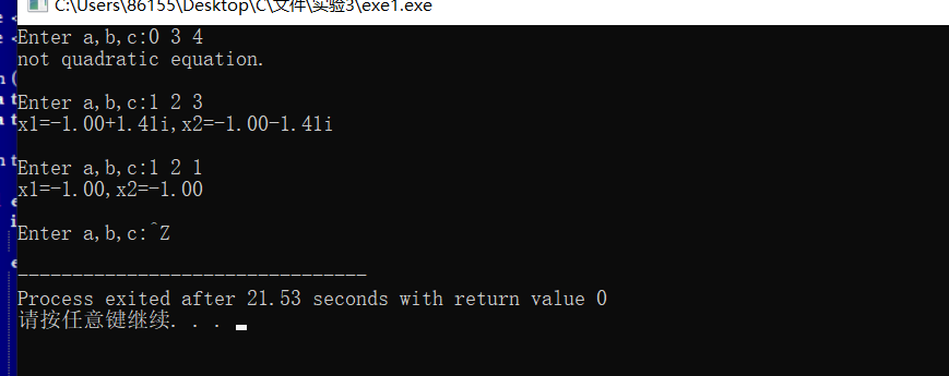 //一元二次方程求解 //重复执行,直到按Ctrl+Z结束 // #include<math.h> #include<stdio.h> int main(){ float a,b,c,x1,x2; float delta,real,imag; printf("Enter a,b,c:"); while(scanf("%f%f%f",&a,&b,&c)!=EOF){ if(a==0) printf("not quadratic equation.\n\n"); else{ delta=b*b-4*a*c; if(delta>=0){ x1=(-b+sqrt(delta))/(2*a); x2=(-b-sqrt(delta))/(2*a); printf("x1=%.2f,x2=%.2f\n\n",x1,x2); } else{ real=-b/(2*a); imag=sqrt(-delta)/(2*a); printf("x1=%.2f+%.2fi,x2=%.2f-%.2fi\n\n",real,imag,real,imag); } } printf("Enter a,b,c:"); } return 0; }