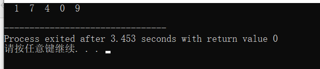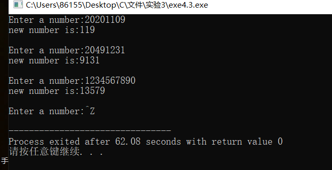 //取s每一数位上的奇数来构成一个新数,高位仍在高位,低位仍在低位。 #include<stdio.h> #include<math.h> int main(){ int a,b; long s; double y; printf("Enter a number:"); while(scanf("%ld",&s)!=EOF) { printf("new number is:"); int n=1,i=0; do { a=s%10; b=s/10; if(a%2==1) { n=n+1; y=pow(10.0,(n-2)); i=a*(int)y+i; } s=b; }while(b>0); printf("%d",i); printf("\n"); printf("\n"); printf("Enter a number:"); } return 0; }