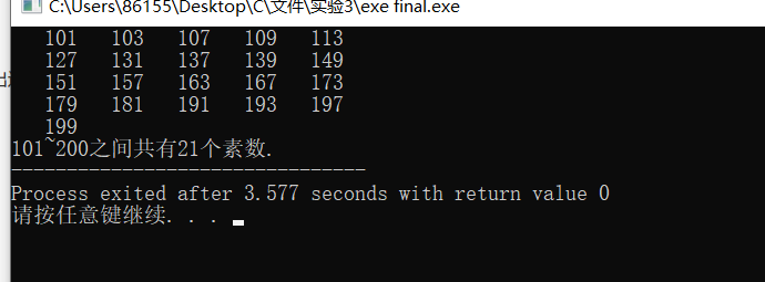 //输出101~200之间所有素数,并输出这一区间内素数个数。 #include<stdio.h> int main(){ int x,n=0,i; for(x=101;x<=200;x++) { for(i=2;i<x;i++) { if(x%i==0) { break; } else if(i==x-1) { printf("%6d",x); n++; if(n%5==0) { printf("\n"); } } } } printf("\n"); printf("101~200之间共有%d个素数.",n); return 0; }