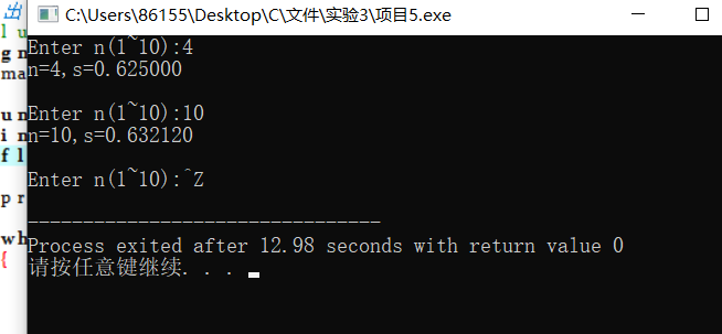 //输出计算结果s #include<stdio.h> unsigned int getfactorial(unsigned int i); int main() { unsigned int x,fac; int n; float a,s; printf("Enter n(1~10):"); while(scanf("%d",&n)!=EOF) { for(x=1;x<=n;x++) { fac=getfactorial(x); a=1.0/fac; if(x%2==0) { s=(-1)*a+s; } else { s=a+s; } } printf("n=%d,s=%.6lf",n,s); s=0; printf("\n"); printf("\n"); printf("Enter n(1~10):"); } return 0; } unsigned int getfactorial(unsigned int i) { unsigned int result; if(i==1) result=1; else result=i*getfactorial(i-1); return result; }