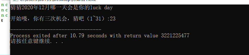 #include<stdio.h> #include<stdlib.h> #include<time.h> int main() { int x,a; srand(time(0)); x=rand()%31+1; printf("猜猜2020年12月哪一天会是你的luck day\n\n"); printf("开始喽,你有三次机会,猜吧(1~31):"); scanf("%d",a); printf("\n"); int n=0; for(n;n<3;n++) { if(a==x) { printf("恭喜你,猜对了!\n"); break; } if(a<x) printf("你猜的日期晚了,luck day悄悄溜到前面啦\n"); if(a>x) printf("你猜的日期早了,luck day还没到呢\n"); printf("再猜(1~31):"); scanf("%d",a); } if(n==3) { printf("\n"); printf("次数用完啦,偷偷告诉你:12月,你的luck day是%d号",x); } return 0; }