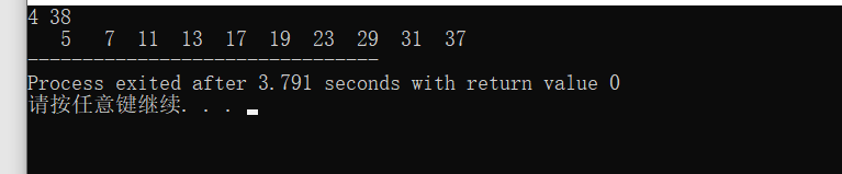 //寻找两个整数之间的所有素数(包括这两个整数),把结果保存在数组bb中,函数返回素数的个数。 // 例如,输入6和21,则输出为:7 11 13 17 19。 #include <stdio.h> #define N 1000 int fun(int n,int m,int bb[N]) { int i,j,k=0,flag; for(j=n;j<=m;j++) { flag=1; for(i=2;i<j;i++) if(j%i==0) { flag=0; break; } if(flag==1) bb[k++]=j; } return k; } int main(){ int n=0,m=0,i,k,bb[N]; scanf("%d",&n); scanf("%d",&m); for(i=0;i<m-n;i++) bb[i]=0; k=fun(n,m,bb); for(i=0;i<k;i++) printf("%4d",bb[i]); return 0; }