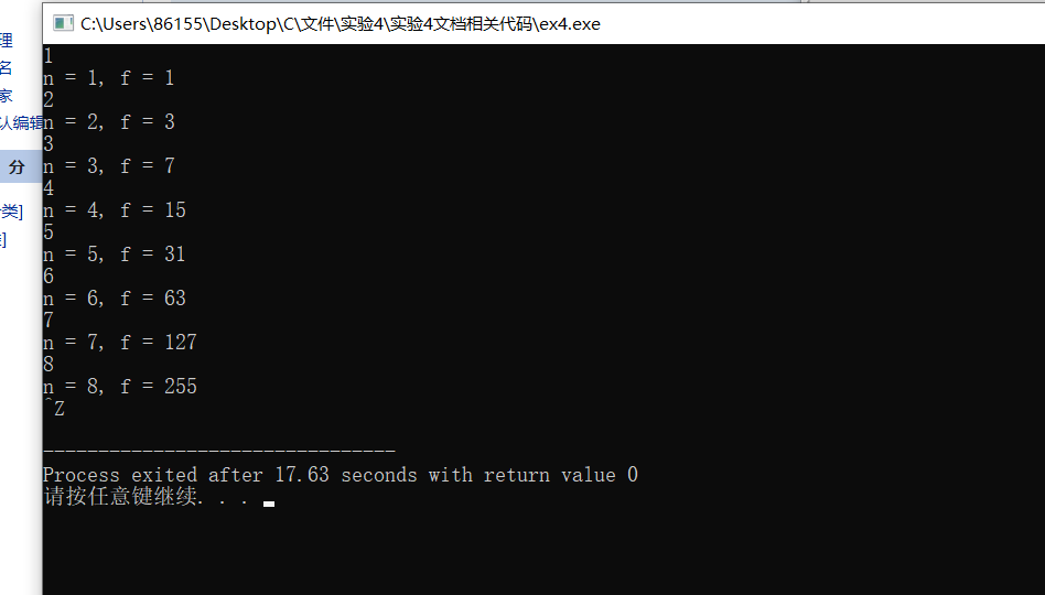 #include <stdio.h> long long fun(int n); // 函数声明 int main() { int n; long long f; while(scanf("%d", &n) != EOF) { f = fun(n); // 函数调用 printf("n = %d, f = %lld\n", n, f); } return 0; } // 函数定义 // 补足。。。 long long fun(int n) { long long result; if(n==1) result=1; else result=2*fun(n-1)+1; return result; }