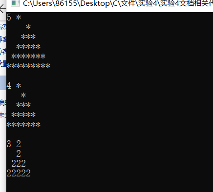 #include <stdio.h> void draw(int n, char symbol); // 函数声明 #include <stdio.h> int main() { int n, symbol; while(scanf("%d %c", &n, &symbol) != EOF) { draw(n, symbol); // 函数调用 printf("\n"); } return 0; } // 函数定义 // 补足代码。。。 void draw(int n, char symbol) { int line,i,j; for(line=1;line<=n;line++) { for(i=1;i<=(n-line);i++) { printf(" "); } for(j=1;j<=(2*line-1);j++) { printf("%c",symbol); } printf("\n"); } }