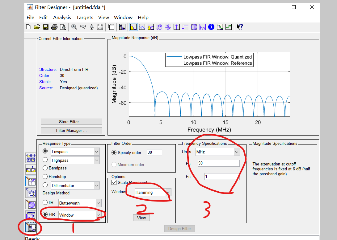 1.以设计为低通为例->选择为海明窗函数窗函数->设计采样频率50MHZ->设计截止频率为1MHZ