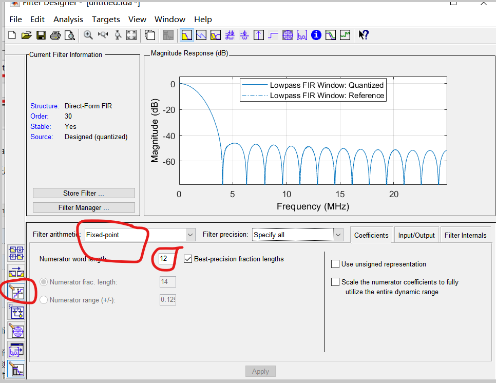 Numerator word length设定数据的长度(影响滤波器)实测16位可达到较好的滤波效果。