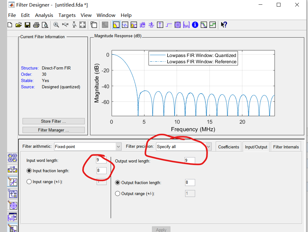 3.先选择Filter precision为Specify all(这样才能设置output wordth length)设计配置输入输出的为宽(因为本实验使用的ADDA模块AN108 AD采样与DA输出数据都为8位),而又MATLAB生成的滤波器数据类型为signed即有符号位。因此实际的滤波器输入即输出数据应该为9位,最高位默认为0作为符号位。