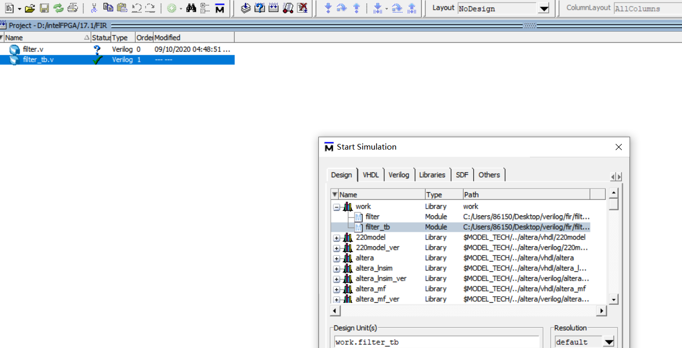 3-2使用modisim仿真,新建工程,添加测试文件,compile验证成功后进行SIMULATE仿真,选中filter_tb文件。