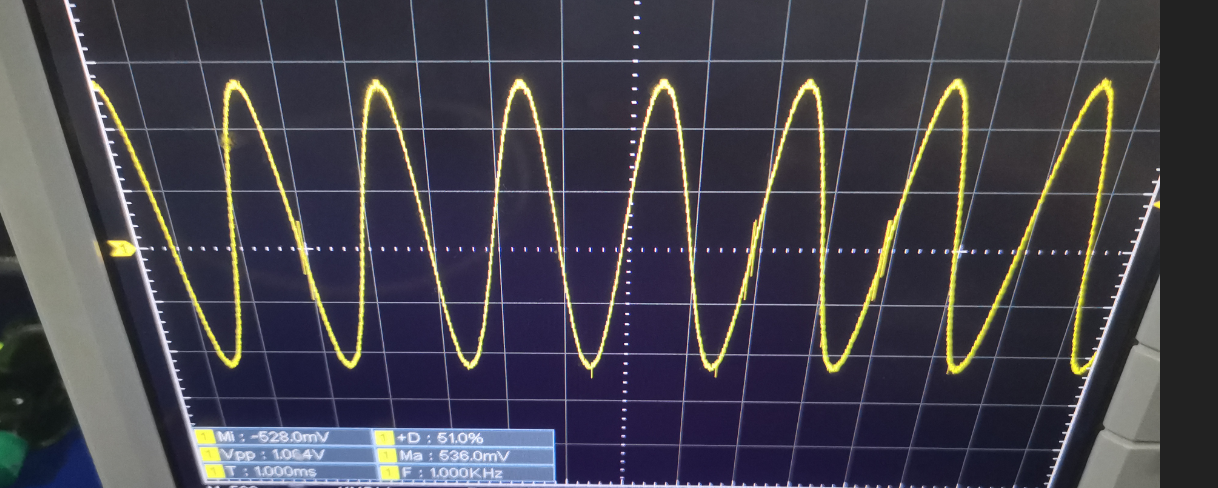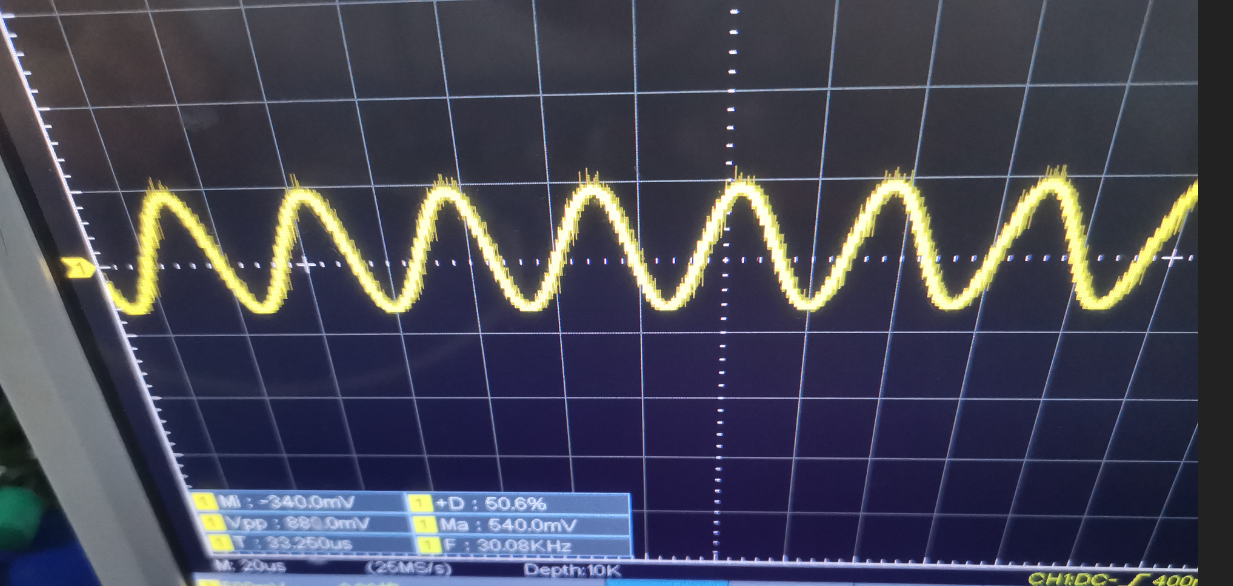 第二次测试较低频率的低通,选择滤波器时钟为1MHZ(将系统时钟用PLL锁相环50分频),截止频率设为30KHZ。效果图如下,图1为1KHZ的波形,较为清晰无失真。图2为30KHZ,失真较严重,虽然截止频率与设计预期基本相同。