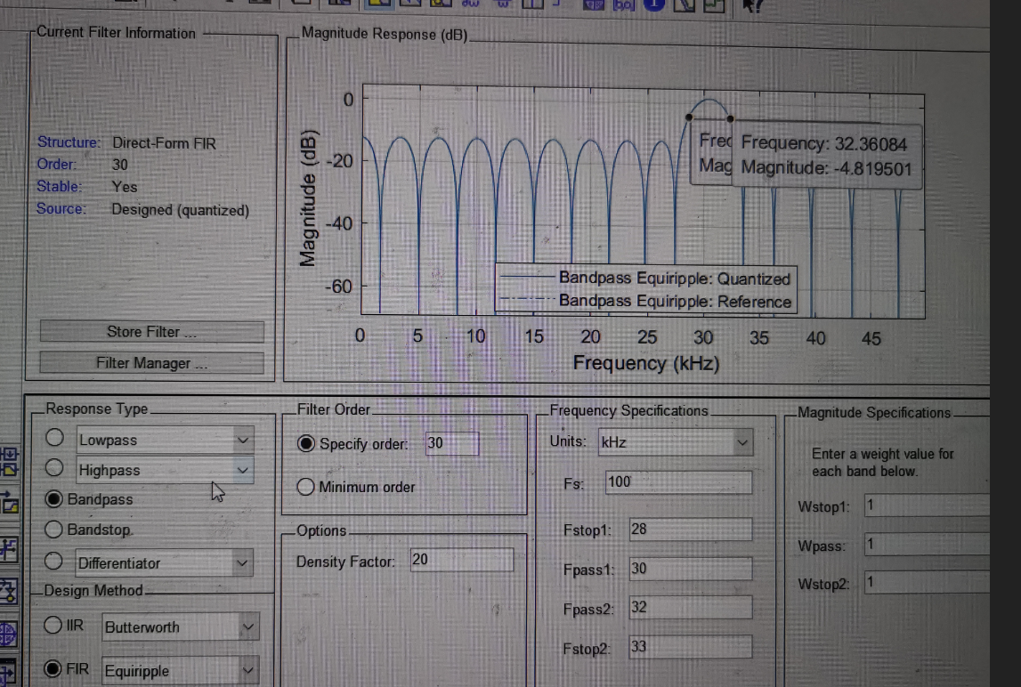 之后又尝试了带通滤波器设计,MATLAB设计图如下,实际测试结果也与预期相仿,但是存在的问题便是失真严重,因为采样频率才100K,而截止达到30K。尝试提高采样频率,难以实际出想要的效果。