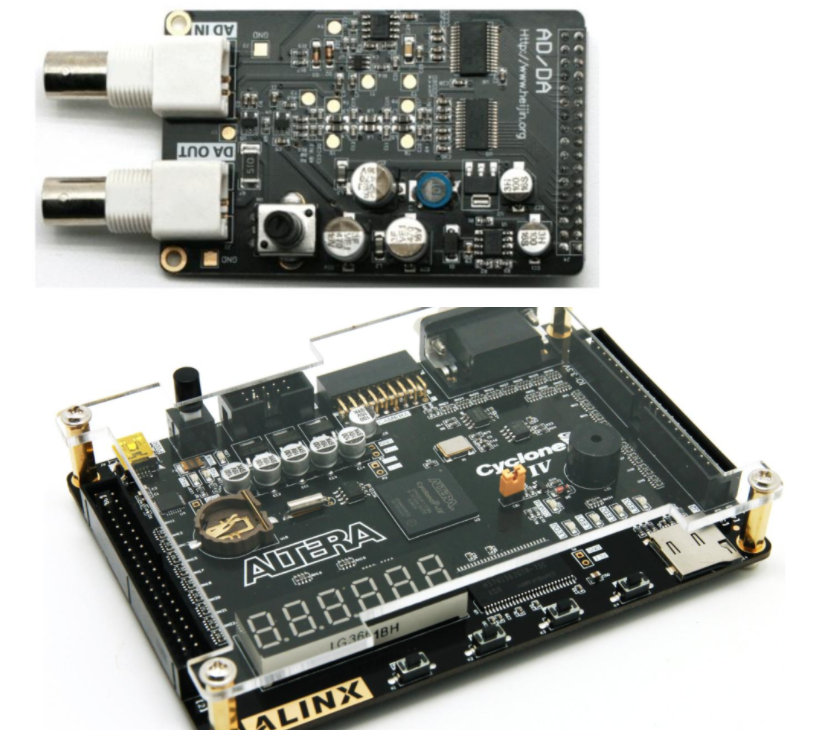2)实验平台:ALINIX黑金AX301开发板,芯片型号:ALTERA 公司的 Cyclone IV 系列 FPGA,型号为 EP4CE6F17C8, 芯片封装为FBGA,AN108ADDA模块。