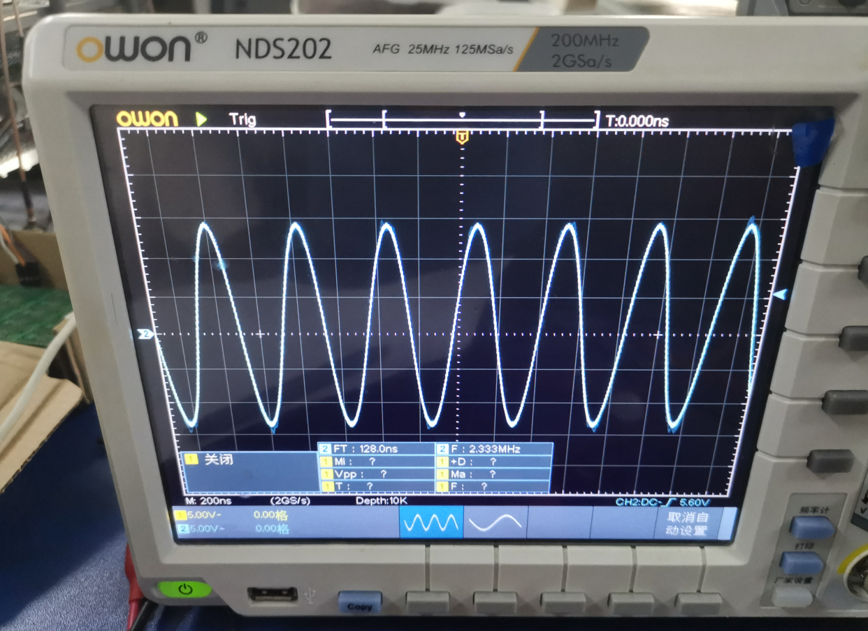 成功实现2MHZ内精确的频率设置(2MHZ内精确到1HZ应该是没问题的,但是示波器2M时精确度的小数位数未设置所以不能直接观察到),并通过按键来实现3种频率的转换。以下为实际效果图。