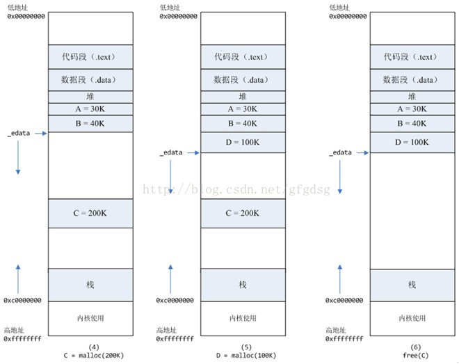 使用brk分配内存,将_edata往高地址推(只分配虚拟空间,不对应物理内存(因此没有初始化),第一次读/写数据时,引起内核缺页中断,内核才分配对应的物理内存,然后虚拟地址空间建立映射关系),如下图: