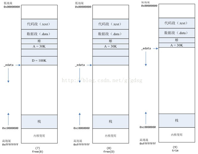 当最高地址空间的空闲内存超过128K(可由M_TRIM_THRESHOLD选项调节)时,执行内存紧缩操作(trim)。在上一个步骤free的时候,发现最高地址空闲内存超过128K,于是内存紧缩,变成图9所示。