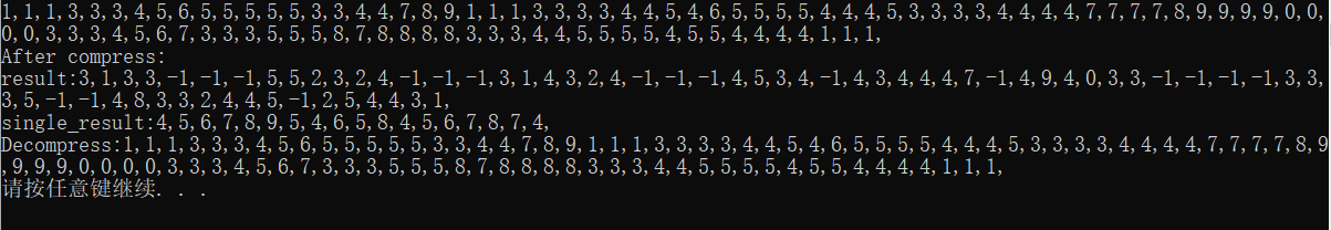 1 #include<iostream> 2 #include<vector> 3 using namespace std; 4 void compress(int *p,vector<int> *result,vector<int> *single_result){ 5 int currval=0,val=0; 6 if(currval=*p){ 7 int cnt=1; 8 for(int i=1;i<100;i++){ 9 val=*(p+i); 10 if(val==currval) 11 ++cnt; 12 else{ 13 if(cnt!=1){ 14 result->push_back(cnt); 15 result->push_back(currval); 16 } 17 else{ 18 result->push_back(-1); 19 single_result->push_back(currval); 20 } 21 currval=val; 22 cnt=1; 23 } 24 } 25 if(cnt!=1){ 26 result->push_back(cnt); 27 result->push_back(currval); 28 } 29 else{ 30 result->push_back(-1); 31 single_result->push_back(currval); 32 } 33 } 34 } 35 void decompress(vector<int> *result,vector<int> *single_result){ 36 vector<int> final; 37 for(int i=0,j=0;i<result->size();){ 38 if((*result)[i]!=-1){ 39 for(int k=0;k<(*result)[i];k++){ 40 final.push_back((*result)[i+1]); 41 } 42 i+=2; 43 } 44 else{ 45 final.push_back((*single_result)[j]); 46 j++; 47 i++; 48 } 49 } 50 for(auto a:final){ 51 cout<<a<<","; 52 } 53 cout<<endl; 54 } 55 int main(){ 56 int a[100]={1,1,1,3,3,3,4,5,6,5,5,5,5,5,3,3,4,4,7,8,9,1,1,1,3,3,3,3,4,4,5,4,6,5,5,5,5,4,4,4,5,3,3,3,3,4,4,4,4,7,7,7,7,8,9,9,9,9,0,0,0,0,3,3,3,4,5,6,7,3,3,3,5,5,5,8,7,8,8,8,8,3,3,3,4,4,5,5,5,5,4,5,5,4,4,4,4,1,1,1}; 57 vector<int> *result=new vector<int>; 58 vector<int> *single_result=new vector<int>; 59 compress(a,result,single_result); 60 cout<<"After compress:"; 61 for(auto a:*result) cout<<a<<","; 62 cout<<endl; 63 for(auto a:*single_result) cout<<a<<","; 64 cout<<endl; 65 cout<<"Decompress:"; 66 decompress(result,single_result); 67 delete result; 68 delete single_result; 69 system("pause"); 70 return 0; 71 }