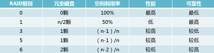 一共有0~6一共7种,这其中RAID 0、RAID1、RAID 5和RAID6比较常用。RAID 0:如果你有n块磁盘,原来只能同时写一块磁盘,写满了再下一块,做了RAID 0之后,n块可以同时写,速度提升很快,但由于没有备份,可靠性很差。n最少为2。RAID 1:正因为RAID 0太不可靠,所以衍生出了RAID 1。如果你有n块磁盘,把其中n/2块磁盘作为镜像磁盘,在往其中一块磁盘写入数据时,也同时往另一块写数据。坏了其中一块时,镜像磁盘自动顶上,可靠性最佳,但空间利用率太低。n最少为2。RAID 3:为了说明白RAID 5,先说RAID 3.RAID 3是若你有n块盘,其中1块盘作为校验盘,剩余n-1块盘相当于作RAID 0同时读写,当其中一块盘坏掉时,可以通过校验码还原出坏掉盘的原始数据。这个校验方式比较特别,奇偶检验,1 XOR 0 XOR 1=0,0 XOR 1 XOR 0=1,最后的数据时校验数据,当中间缺了一个数据时,可以通过其他盘的数据和校验数据推算出来。但是这有个问题,由于n-1块盘做了RAID 0,每一次读写都要牵动所有盘来为它服务,而且万一校验盘坏掉就完蛋了。最多允许坏一块盘。n最少为3.RAID 5:在RAID 3的基础上有所区别,同样是相当于是1块盘的大小作为校验盘,n-1块盘的大小作为数据盘,但校验码分布在各个磁盘中,不是单独的一块磁盘,也就是分布式校验盘,这样做好处多多。最多坏一块盘。n最少为3.