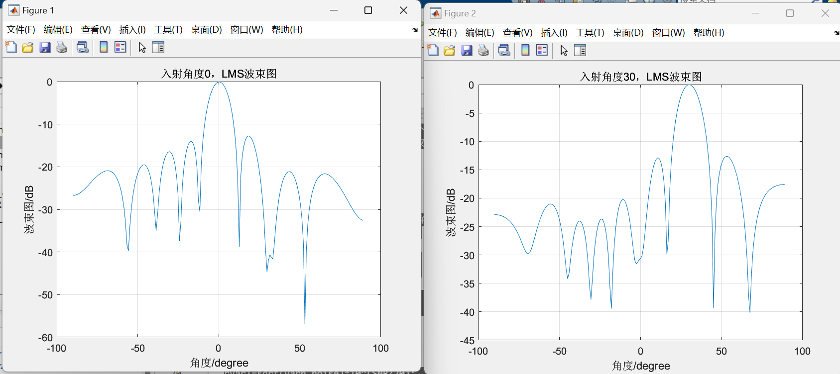 本文仅对上表中的最小均方算法和递推最小二乘算法进行仿真,如果后面有用到Bussgang算法,再来学习这个算法。需要注意一点的是在RLS算法中,遗忘因子的值越接近1波束形成效果越好,越接近0,波束形成的效果会很差。