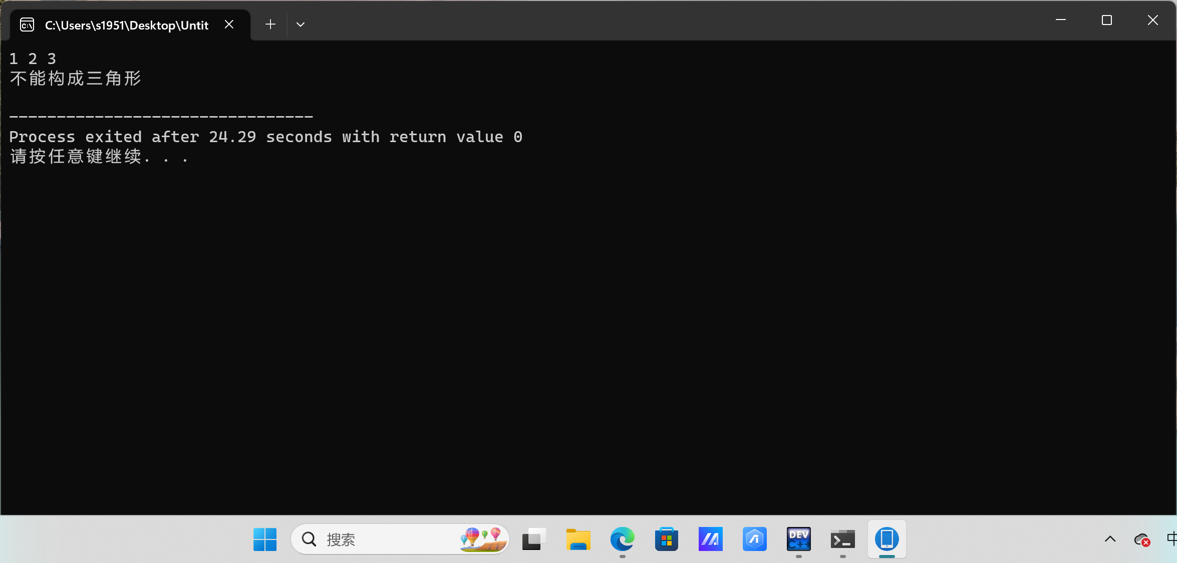 #include<stdio.h> int main() { float a,b,c; scanf("%f%f%f",&a,&b,&c); if(a+b>c&a+c>b&b=c>a) printf("能构成三角形\n"); else printf("不能构成三角形\n"); return 0; }