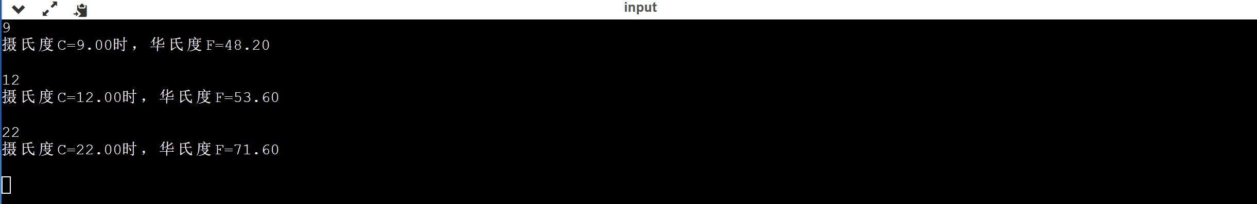 printf("摄氏度C=%.2lf时,华氏度F=%.2lf\n", C, F);