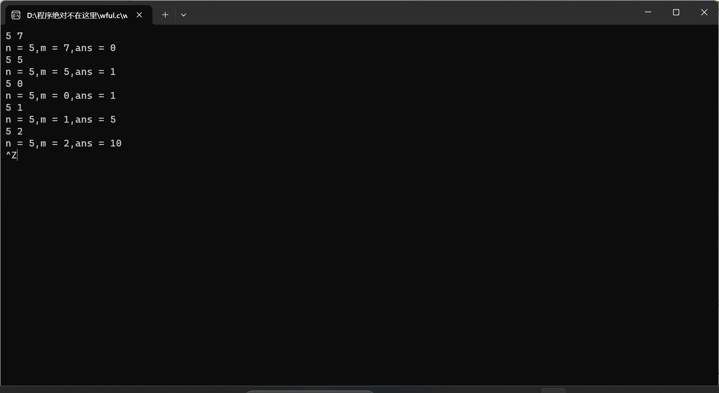 #include <stdio.h> int func(int n,int m); int main() { int n, m; while(scanf("%d%d",&n,&m) != EOF) { printf("n = %d,m = %d,ans = %d\n",n,m,func(n,m)); } return 0; } int func(int n,int m) { if(m>n) return 0; else if(m==0||n==m) return 1; else return func(n-1,m)+func(n-1,m-1); }