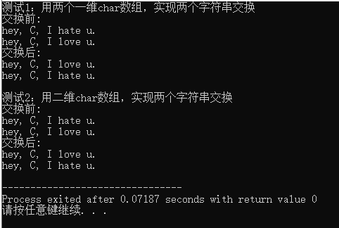 printf("测试1:用两个一维char数组,实现两个字符串交换\n");