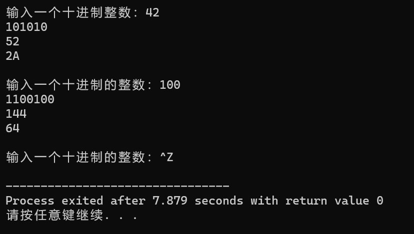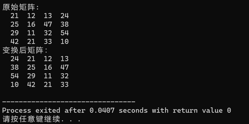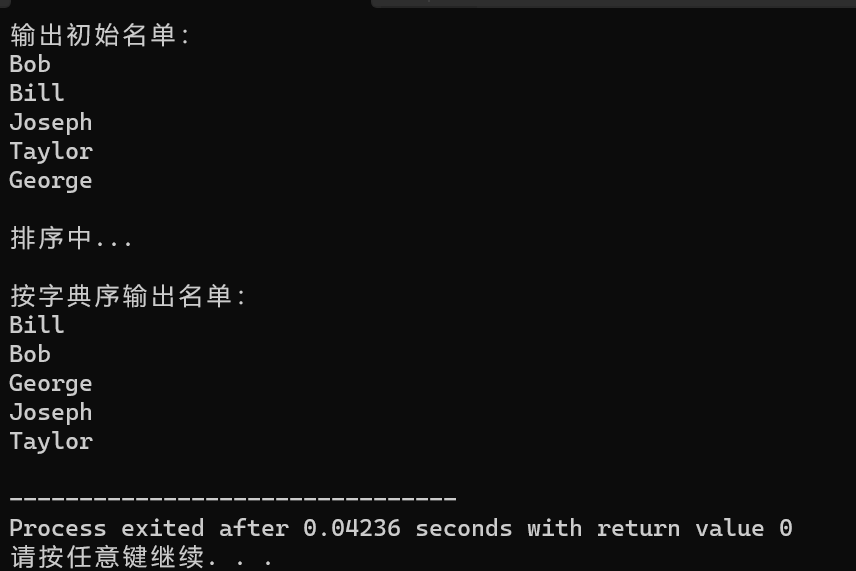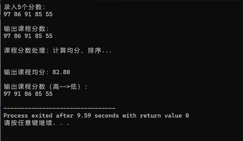 include<stdio.h> #define N 5 void input(int x[],int n); void output(int x[],int n); double average(int x[],int n); void bubble_sort(int x[],int n); int main() { int scores[N]; double ave; printf("录入%d个分数:\n",N); input(scores,N); printf("\n输出课程分数:\n"); output(scores,N); printf("\n课程分数处理:计算均分、排序...\n"); ave = average(scores,N); bubble_sort(scores,N); printf("\n输出课程均分:%.2f\n",ave); printf("\n输出课程分数(高-->低):\n"); output(scores,N); return 0; } void input(int x[],int n) { int i; for(i = 0;i<n;++i) scanf("%d",&x[i]); } void output(int x[],int n) { int i; for(i = 0;i<n;++i) printf("%d ",x[i]); printf("\n"); } double average(int x[],int n) { int i; double s=0,ave; for(i=0;i<n;++i){ s+=x[i]; } ave=s/n; printf("\n"); return ave; } void bubble_sort(int x[],int n) { int i,j,t; for(i=0;i<n-1;i++){ for(j=0;j<n-i-1;j++){ if(x[j]<x[j+1]){ t=x[j]; x[j]=x[j+1]; x[j+1]=t; } } } }