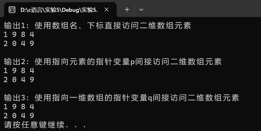 printf("\n输出3: 使用指向一维数组的指针变量q间接访问二维数组元素\n");