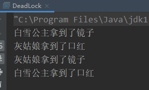 public void makeup() throws InterruptedException { if (choice == 0) {//先拿口红 再拿镜子 synchronized (mirror) { //Thread.currentThread().getName()==this.getName() System.out.println(this.getName() + "拿到了镜子"); Thread.sleep(1000); } synchronized (lipStrick) { System.out.println(this.getName() + "拿到了口红"); } } else { synchronized (lipStrick) { System.out.println(this.getName() + "拿到了口红"); Thread.sleep(2000); } synchronized (mirror) { //Thread.currentThread().getName()==this.getName() System.out.println(this.getName() + "拿到了镜子"); } } }