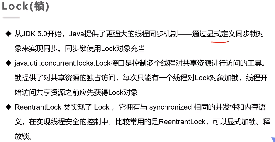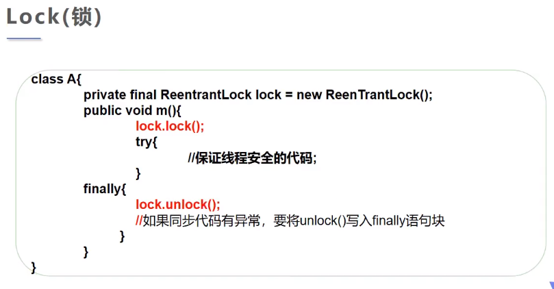 public class TestLock { public static void main(String[] args) { BuyTicket buyTicket = new BuyTicket(); new Thread(buyTicket).start(); new Thread(buyTicket).start(); new Thread(buyTicket).start(); } } class BuyTicket implements Runnable { private int ticketNum = 10; private final ReentrantLock lock = new ReentrantLock(); @Override public void run() { while (true) { //开启锁 lock.lock(); try { if (ticketNum > 0) { try { Thread.sleep(1000); } catch (InterruptedException e) { e.printStackTrace(); } System.out.println(ticketNum--); } else { break; } } finally { //结束锁 lock.unlock(); } } } }