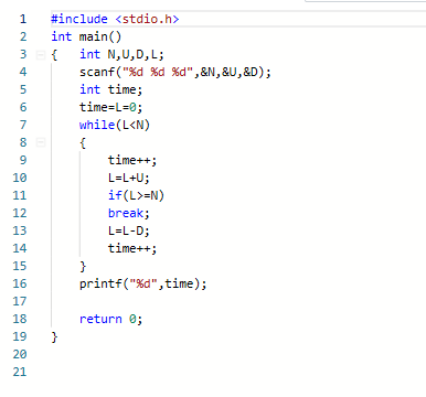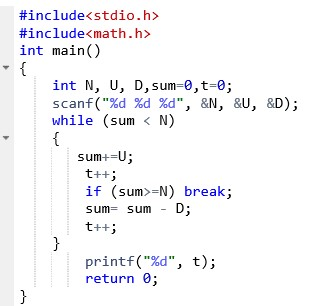 一条蠕虫长1寸,在一口深为N寸的井的底部。已知蠕虫每1分钟可以向上爬U寸,但必须休息1分钟才能接着往上爬。在休息的过程中,蠕虫又下滑了D寸。就这样,上爬和下滑重复进行。请问,蠕虫需要多长时间才能爬出井?