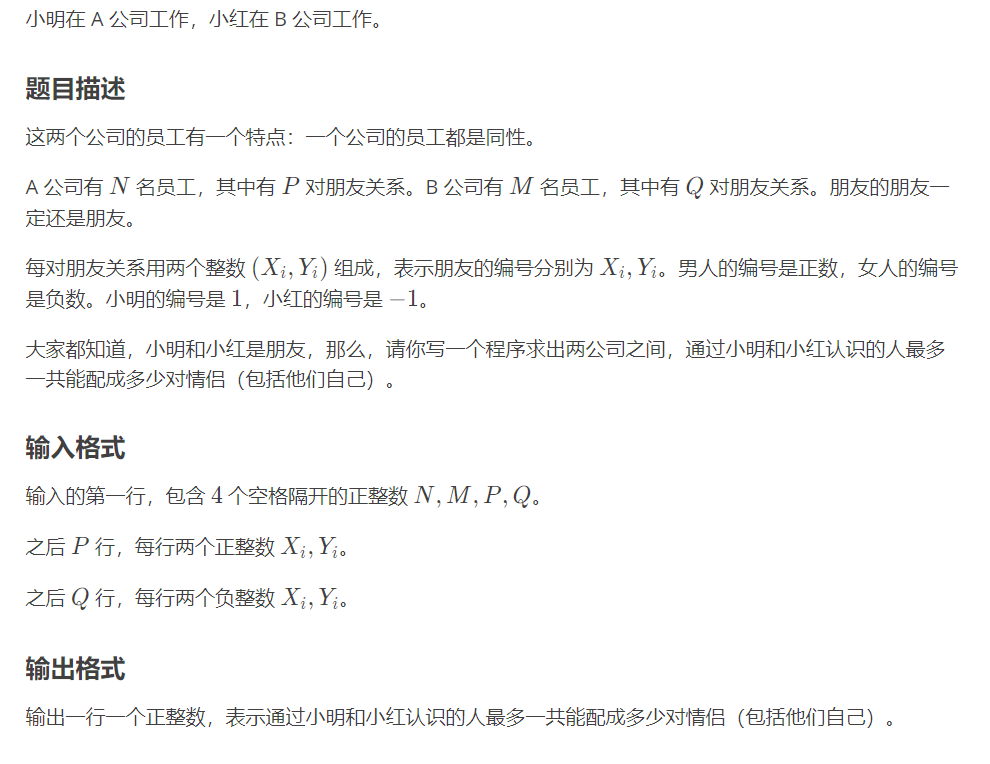 这个题目我觉得题意有点问题的,后面把并查集的模板改成等于就行了,也就是计算两个公司认识1号人的人数取个最小值,因为你不可能凭空造人,对吧?