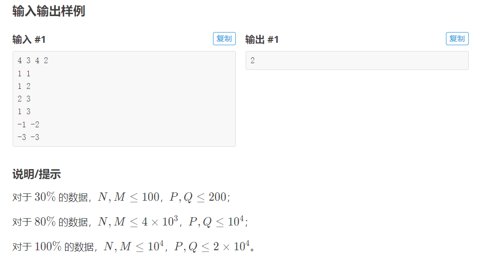 1 #include "bits/stdc++.h" 2 using namespace std; 3 int a[10100],b[10100]; 4 int find(int u,int *n) 5 { 6 if(u == n[u]) 7 return u; 8 return n[u] = find(n[u],n); 9 } 10 int main() 11 { 12 int n,m,p,q; 13 cin >> n >> m >> p >> q; 14 for(int i = 1;i <= n;i++) 15 a[i] = i; 16 for(int i = 1;i <= m;i++) 17 b[i] = i; 18 int fx,fy; 19 for(int i = 1;i <= p;i++){ 20 cin >> fx >> fy; 21 fx = find(fx,a); 22 fy = find(fy,a); 23 a[fy] = fx; 24 } 25 26 for(int j = 1;j <= q;j++){ 27 cin >> fx >> fy; 28 fx = -fx; 29 fy = -fy; 30 fx = find(fx,b); 31 fy = find(fy,b); 32 b[fy] = fx; 33 } 34 35 int cnt1,cnt2; 36 cnt1 = cnt2 = 0; 37 for(int i = 1;i <= n;i++) 38 if(find(i,a) == find(1,a)) 39 cnt1++; 40 41 for(int j = 1;j <= m;j++) 42 if(find(j,b) == find(1,b)) 43 cnt2++; 44 cout << min(cnt1,cnt2) << endl; 45 return 0; 46 }