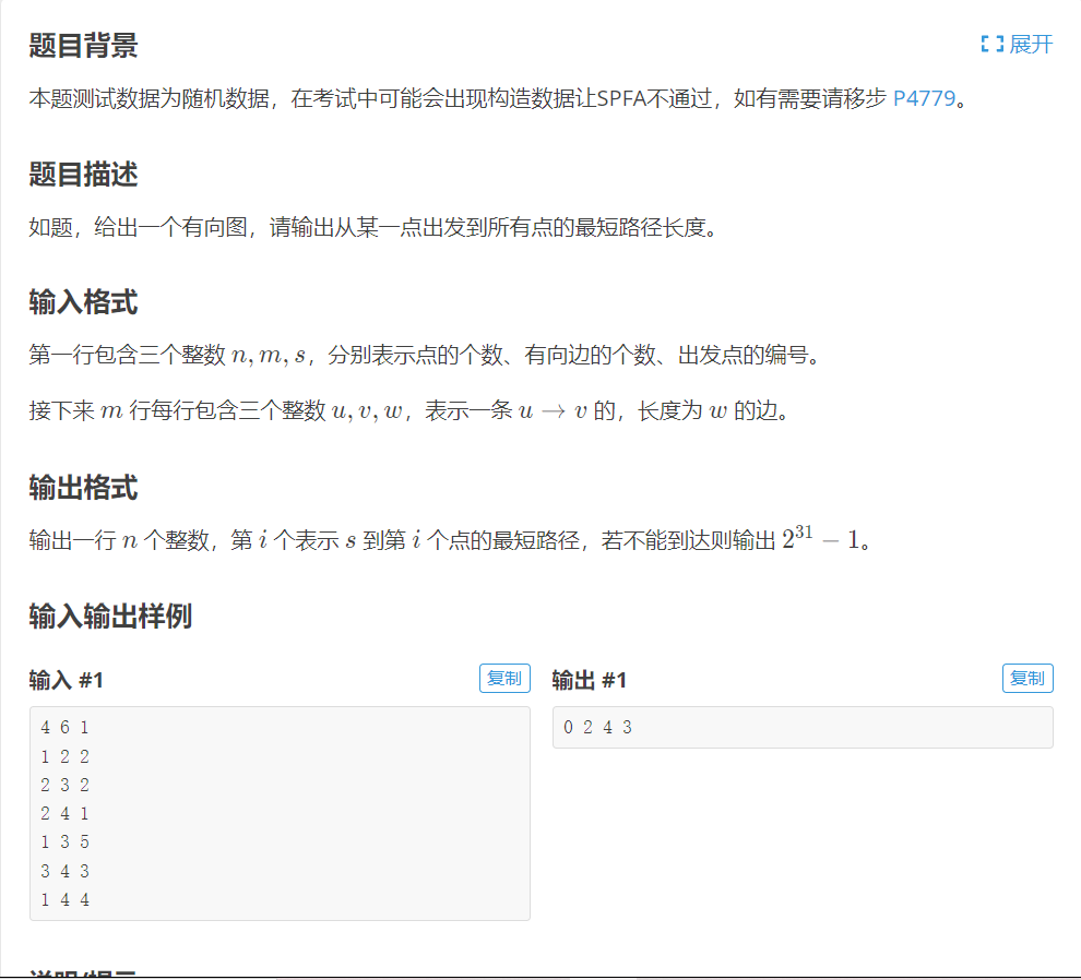 Dijkstra的优化版,时间复杂度用优先队列优化,空间复杂度用链式前向星优化。(标准版直接交就行了)