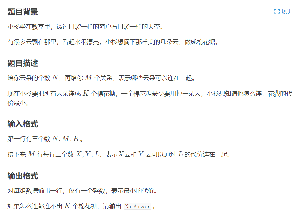 1 #include "bits/stdc++.h" 2 using namespace std; 3 int n,m,k; 4 int a[1010]; 5 struct node{ 6 int from,to; 7 int w; 8 }edges[10010]; 9 int vis[1010]; 10 int cnt; 11 int find(int u) 12 { 13 return u == a[u] ? u : a[u] = find(a[u]); 14 } 15 void init() 16 { 17 for(int i = 1;i <= n;i++) 18 a[i] = i; 19 } 20 bool cmp(node u,node v) 21 { 22 return u.w < v.w; 23 } 24 int main() 25 { 26 cin >> n >> m >> k; 27 for(int i = 1;i <= m;i++){ 28 int u,v,w; 29 cin >> u >> v >> w; 30 edges[++cnt].from = u; 31 edges[cnt].to = v; 32 edges[cnt].w = w; 33 } 34 if(n < k){ 35 cout << "No Answer"; 36 return 0; 37 } 38 init(); 39 sort(edges + 1,edges + 1 + cnt,cmp); 40 int tt = n; 41 long long ans = 0; 42 for(int i = 1;i <= cnt;i++){ 43 int sx = find(edges[i].from); 44 int sy = find(edges[i].to); 45 if(sx != sy){ 46 a[sx] = sy; 47 ans += edges[i].w; 48 tt--; 49 } 50 if(tt == k) 51 break; 52 } 53 if(tt != k) 54 cout << "No Answer"; 55 else 56 cout << ans; 57 return 0; 58 }