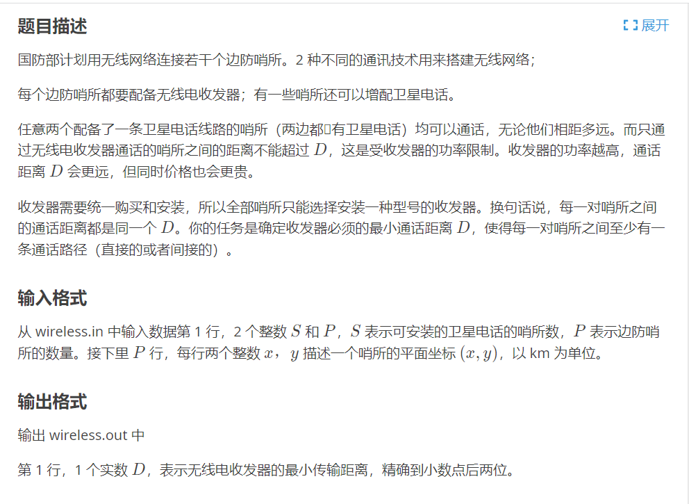 1 #include "bits/stdc++.h" 2 using namespace std; 3 double dis[510]; 4 int vis[510]; 5 struct node{ 6 int from,to; 7 double w; 8 }edges[251000]; 9 const double maxn = 1e9 + 10; 10 int s,p,cnt; 11 double ans = 1e9 + 10; 12 double a[510],b[510]; 13 int c[510]; 14 void init() 15 { 16 for(int i = 1;i <= p;i++) 17 c[i] = i; 18 } 19 int find(int u) 20 { 21 if(u == c[u]) 22 return u; 23 return c[u] = find(c[u]); 24 } 25 bool cmp(node u,node v) 26 { 27 return u.w < v.w; 28 } 29 void kruscal() 30 { 31 int k = 0; 32 sort(edges + 1,edges + cnt + 1,cmp); 33 for(int i = 1;i <= cnt;i++){ 34 int sx = find(edges[i].from); 35 int sy = find(edges[i].to); 36 if(sx != sy){ 37 c[sx] = sy; 38 ans = edges[i].w; 39 k++; 40 if(k >= p - s){ 41 printf("%.2lf",ans); 42 return ; 43 } 44 } 45 } 46 cout << ans; 47 } 48 int main() 49 { 50 cin >> s >> p; 51 init(); 52 for(int i = 1;i <= p;i++){ 53 double p1,p2; 54 cin >> a[i] >> b[i]; 55 for(int j = 1;j < i;j++){ 56 double kis = sqrt(pow(a[i] - a[j],2) + pow(b[i] - b[j],2)); 57 // cout << kis << endl; 58 edges[++cnt].from = i; 59 edges[cnt].to = j; 60 edges[cnt].w = kis; 61 } 62 } 63 kruscal(); 64 return 0; 65 }