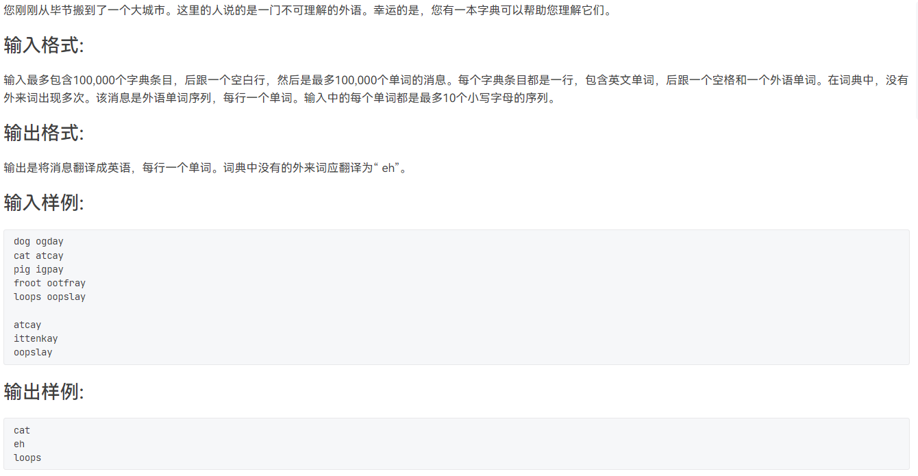 1 #include "bits/stdc++.h" 2 using namespace std; 3 map <string,string> mp; 4 int main() 5 { 6 string a,b; 7 while(1){ 8 cin >> a; 9 if(getchar() == ' '){ 10 cin >> b; 11 mp[b] = a; 12 } 13 else 14 break; 15 } 16 do{ 17 if(mp.count(a)) 18 cout << mp[a] << endl; 19 else 20 cout << "eh" << endl; 21 }while(cin >> a); 22 return 0; 23 }