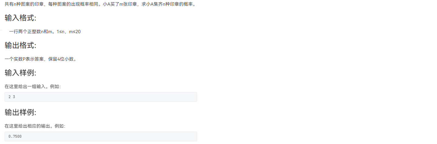 1 #include "bits/stdc++.h" 2 #define PII pair<int,int> 3 #define rep(i,z,n) for(int i = z;i <= n; i++) 4 #define per(i,n,z) for(int i = n;i >= z; i--) 5 #define ll long long 6 #define db double 7 #define vi vector<int> 8 #define debug(x) cerr << "!!!" << x << endl; 9 using namespace std; 10 //从某个串中把某个子串替换成另一个子串 11 string& replace_all(string& src, const string& old_value, const string& new_value) { 12 // 每次重新定位起始位置,防止上轮替换后的字符串形成新的old_value 13 for (string::size_type pos(0); pos != string::npos; pos += new_value.length()) { 14 if ((pos = src.find(old_value, pos)) != string::npos) { 15 src.replace(pos, old_value.length(), new_value); 16 } 17 else break; 18 } 19 return src; 20 } 21 inline ll read() 22 { 23 ll s,r; 24 r = 1; 25 s = 0; 26 char ch = getchar(); 27 while(ch < '0' || ch > '9'){ 28 if(ch == '-') 29 r = -1; 30 ch = getchar(); 31 } 32 while(ch >= '0' && ch <= '9'){ 33 s = (s << 1) + (s << 3) + (ch ^ 48); 34 ch = getchar(); 35 } 36 return s * r; 37 } 38 inline void write(ll x) 39 { 40 if(x < 0) putchar('-'),x = -x; 41 if(x > 9) write(x / 10); 42 putchar(x % 10 + '0'); 43 } 44 double dp[30][30]; 45 int main() 46 { 47 int n,m; 48 n = read(); 49 m = read(); 50 double p = 1.0 / n; 51 for(int i = 1;i <= m;i++){ 52 for(int j = 1;j <= n;j++){ 53 //如果i<j,说明此时i张印章一定不能凑出j种印章 54 if(i < j) dp[i][j] = 0; 55 //如果j==1,此时选出的i张里面都是某一种,概率是(p^i),又因为可能都是n中的同一种,故都需要乘上n,因此概率为(p^(i-1)) 56 else if(j == 1) dp[i][j] = pow(p,i - 1); 57 //如果当前选的和之前选出的j种是同一种,那么此时的概率为(j / n),因为n中里面选出前j种的概率为(j / n) 58 //如果当前选的和之前的不同,说明增加了一种,此时前面选了j - 1种,我们不选到前面j - 1种的概率为(n -(j - 1)) / n = (n - j + 1) / n 59 else dp[i][j] = dp[i - 1][j] * (j * 1.0 / n) + dp[i - 1][j - 1] * ((n - j + 1) * 1.0 / n); 60 } 61 } 62 cout << fixed << setprecision(4) << dp[m][n]; 63 return 0; 64 }