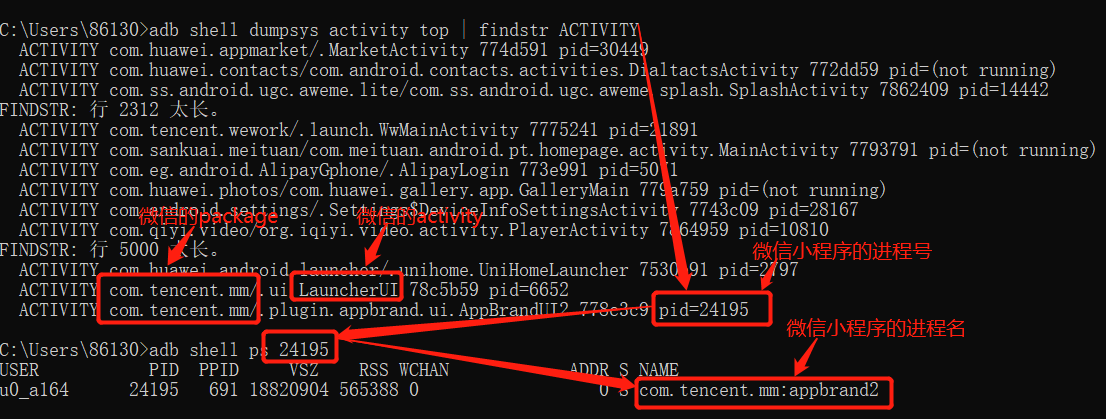 首先可以通过微信包名来筛选,再通过微信的activity筛选掉微信的进程号,另一个就是筛选的结果,再通过筛选结果的进程号来得到进程名