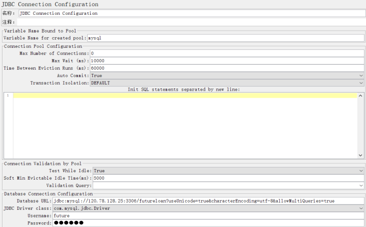 (5)jdbc connection configuration连接需要的数据库,在Database Connection Configuration里填写要连接的数据库信息;如下图: