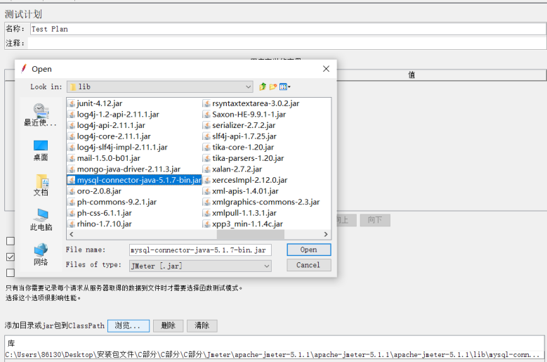 (6)需要在测试计划的浏览中下载驱动类(jdbc driver class:mysql-connection-java.jar)放到jmeter安装目录(lib目录)如下图: