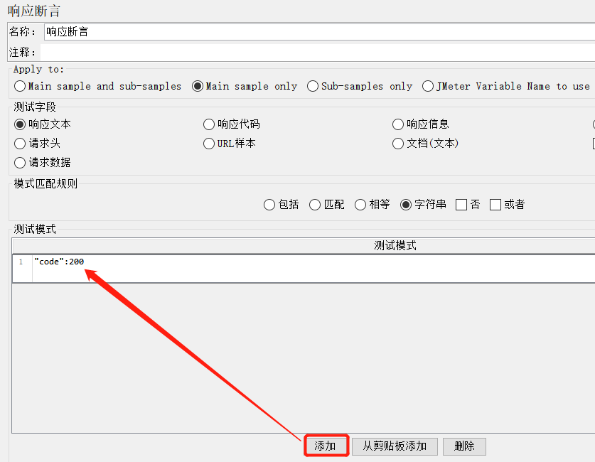 添加-断言-响应断言,对响应结果进行断言,如果实际结果与预期不符,在察看结果树中执行的请求结果会报红。