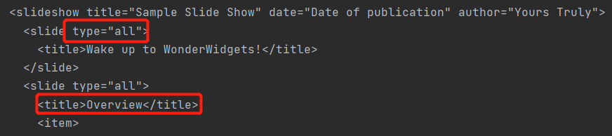 String shuxing=xmlres.xmlPath().get("slideshow.slide[0].@type"); //获取第一个slide标签的type属性值 String title=xmlres.xmlPath().get("slideshow.slide[1].title"); //获取第二个slide标签的title文本值