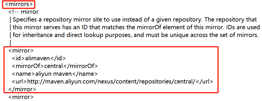 在settings.xml中搜索mirror,在<mirrors>和</mirrors>之间添加阿里云镜像(mirrors下可能有多个mirror镜像,阿里云镜像添加在第一个)