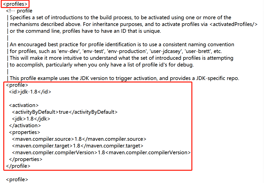 在settings.xml中搜索profiles,在<profiles>和</profiles>之间添加jdk配置